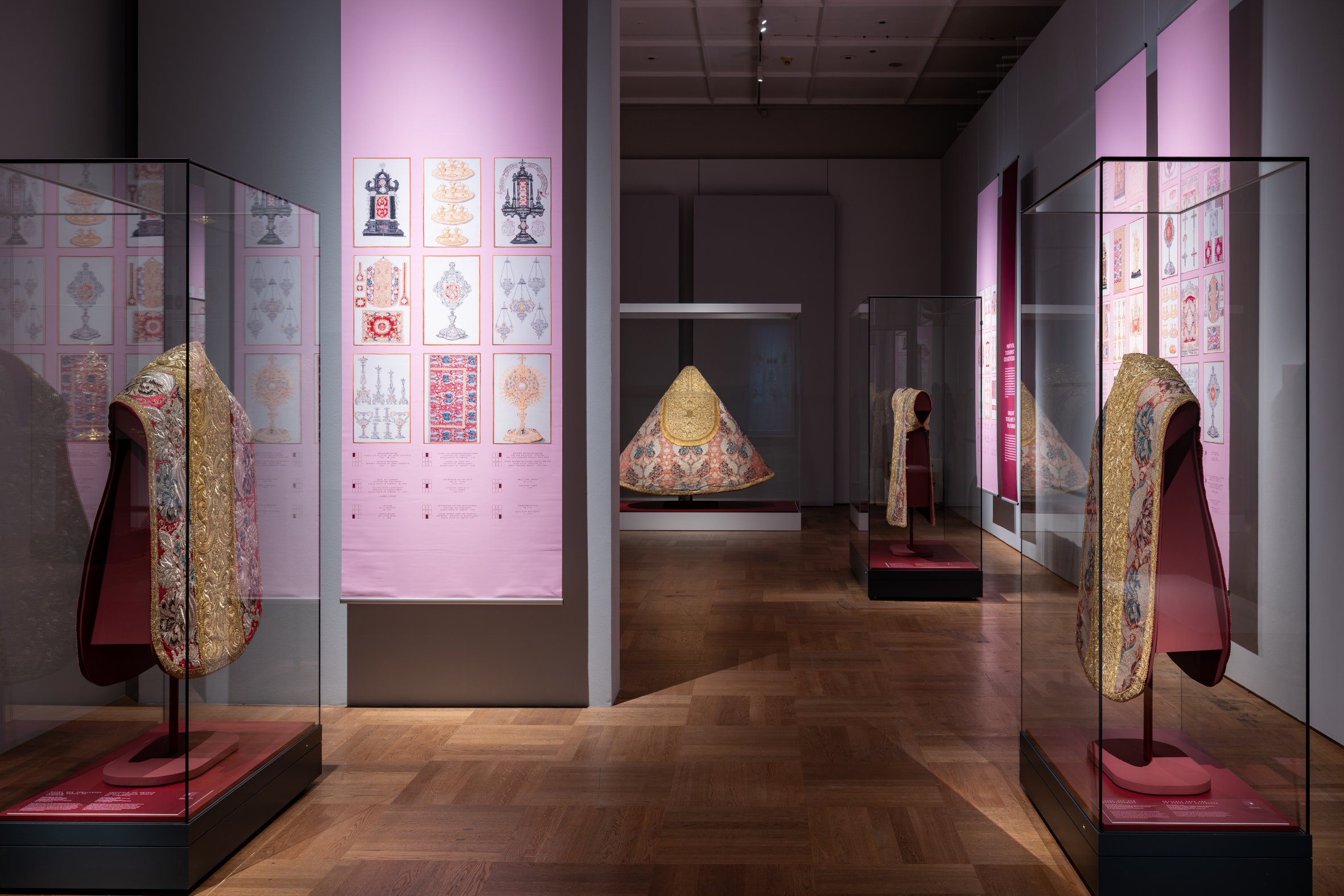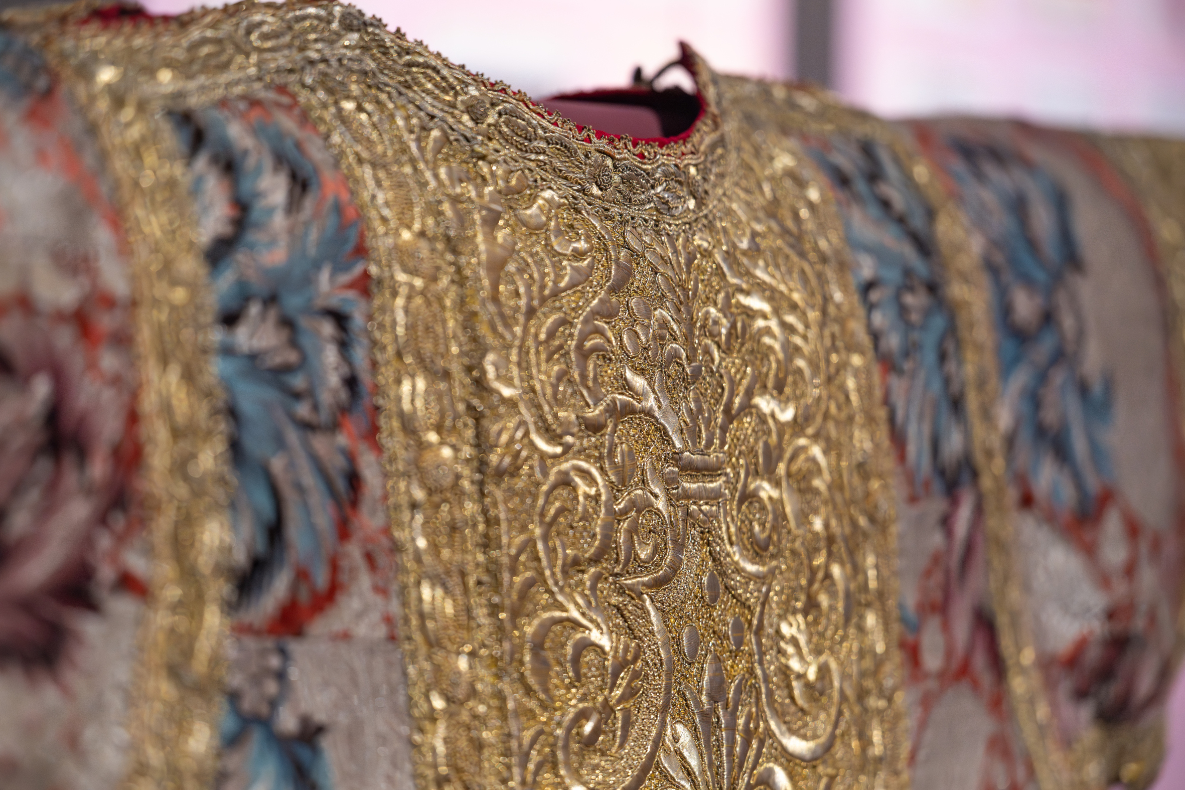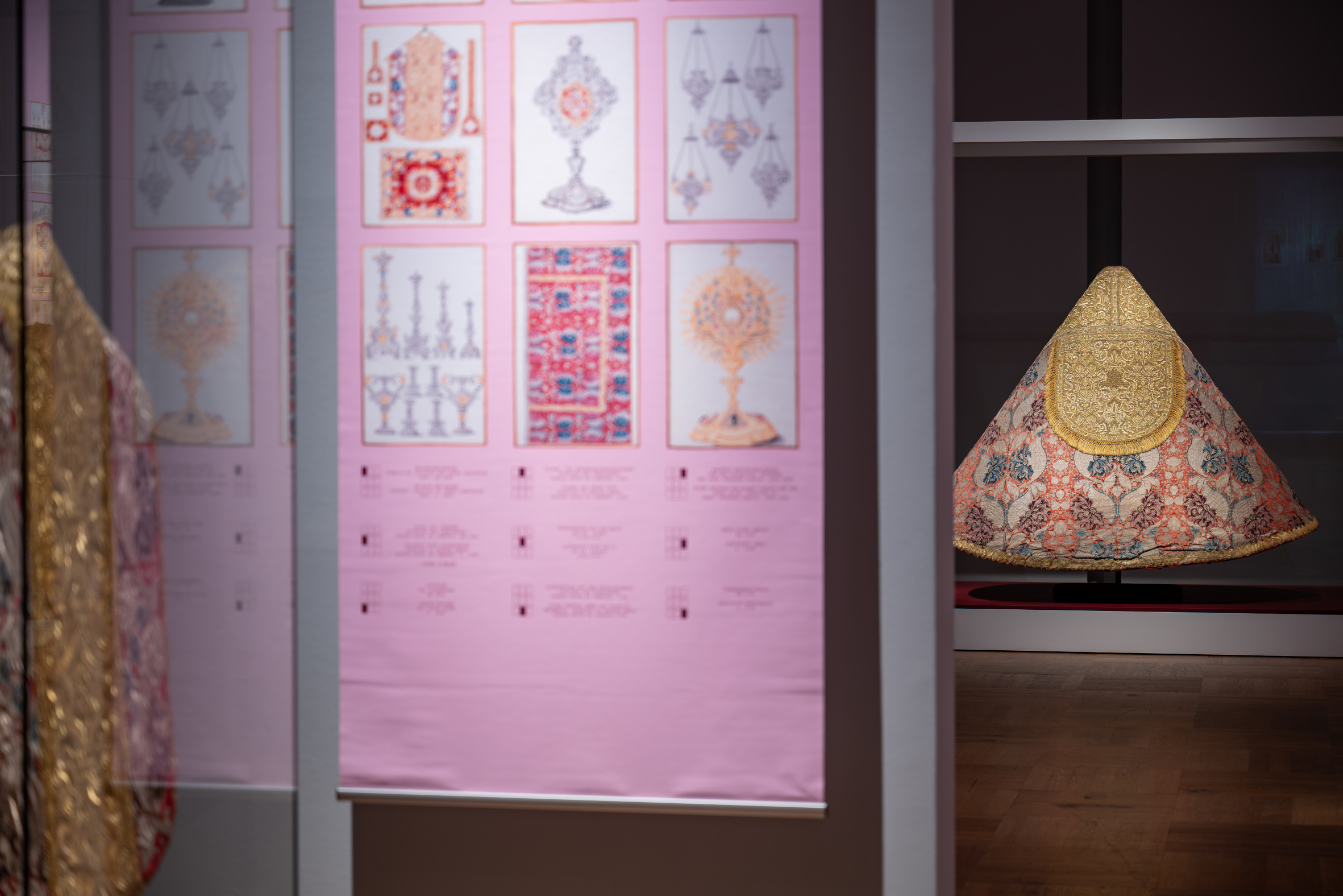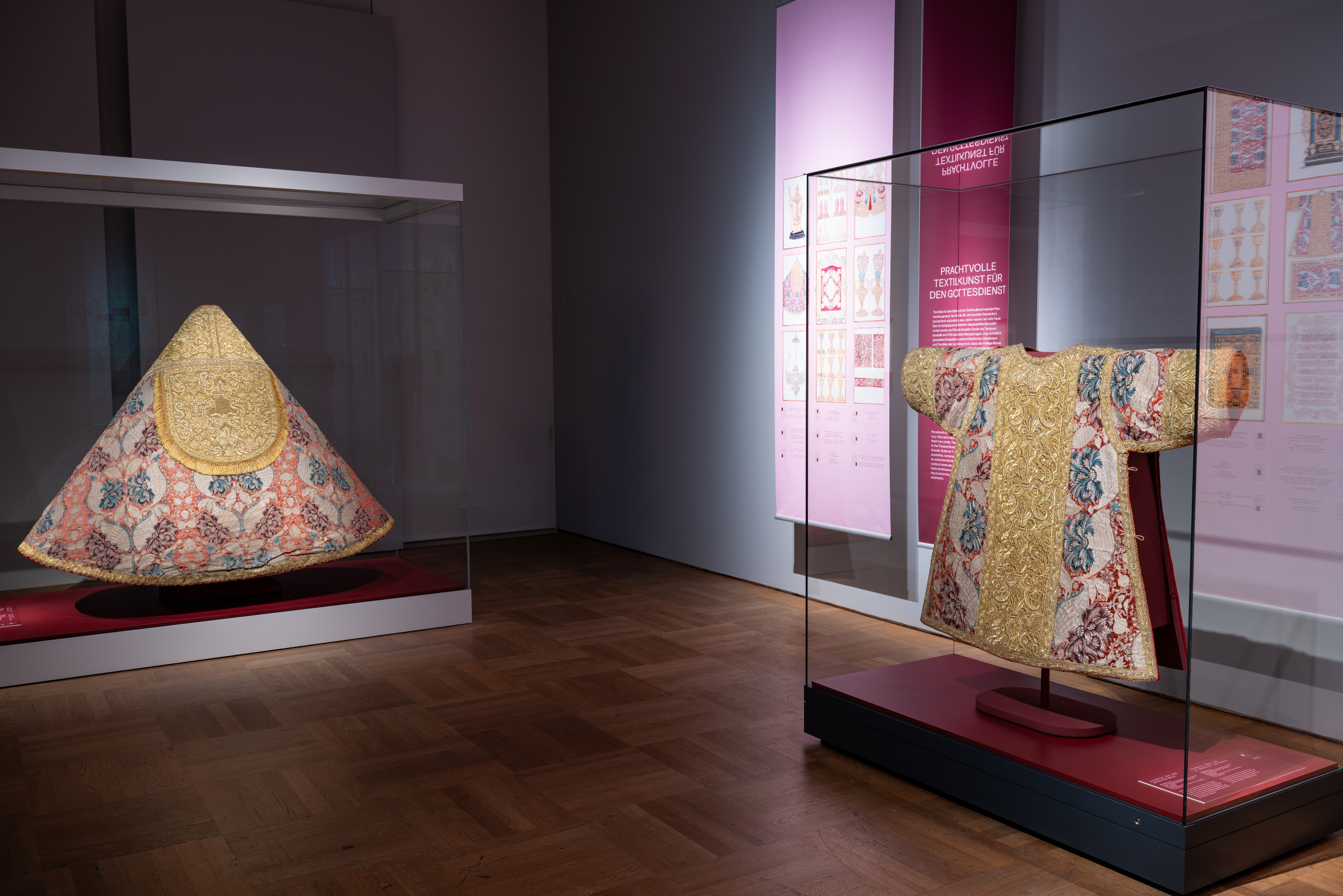 Der vorn offene Umhang, der um die Schultern gelegt wird und frei nach unten fällt, wird Pluviale genannt. Geistliche tragen es bei feierlichen Amtshandlungen außerhalb der Messe wie Prozessionen, Andachten, Weihen und Segnungen. Das auffallend gemusterte, kostbare Seidengewebe wurde vermutlich in Neapel hergestellt, einem wichtigen Webzentrum im 18. Jahrhundert.