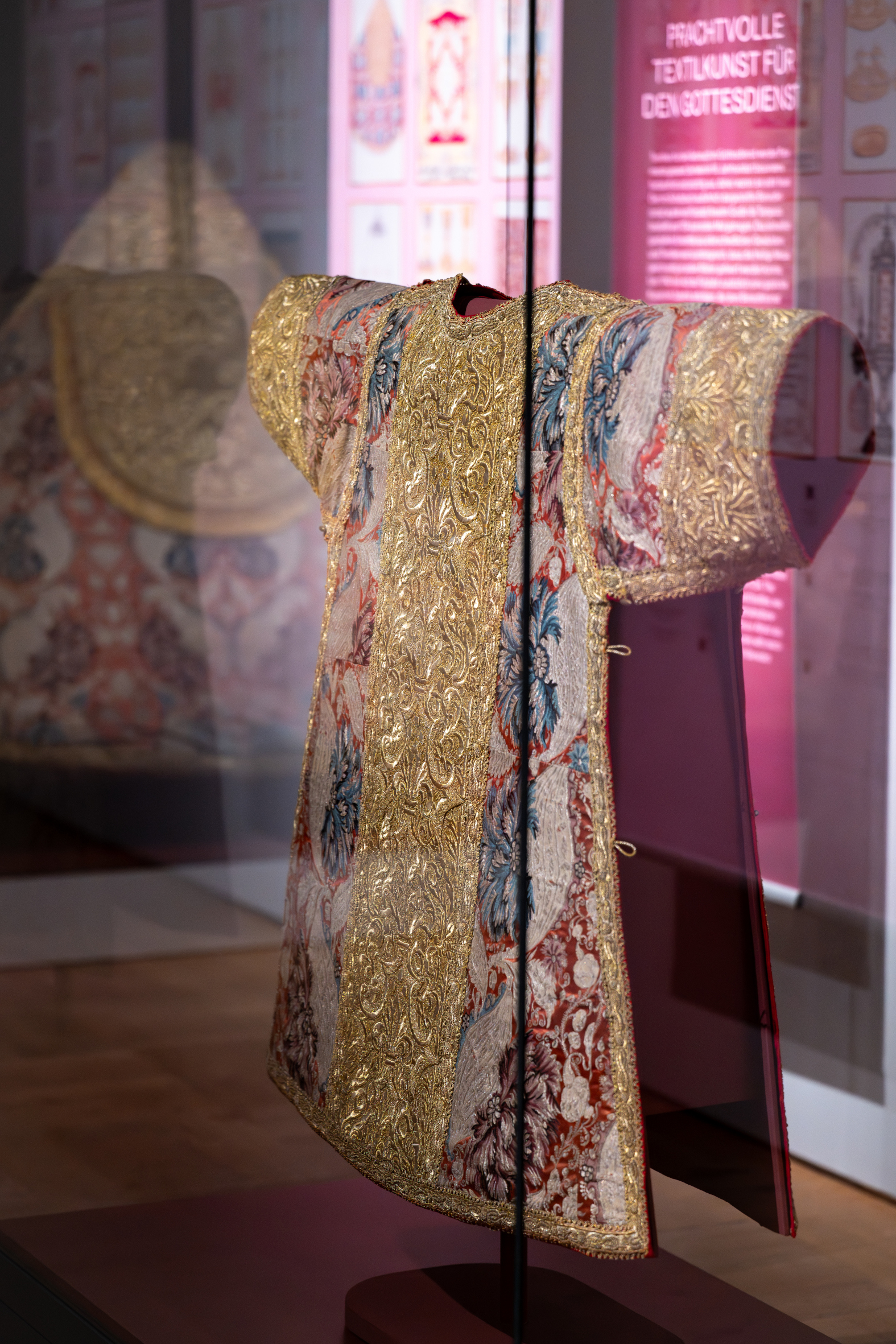 Die Dalmatik ist das Gewand für den Diakon. Er assistiert dem Priester während der Heiligen Messe. Charakteristisch ist die T-förmige Schnittform, die noch aus der Antike stammt. Vermutlich hatte eine süddeutsche Stickereiwerkstatt die breiten Goldbesätze hergestellt. Sie wurden fertig eingekauft und von einem Regensburger Schneider auf der Dalmatik angebracht.