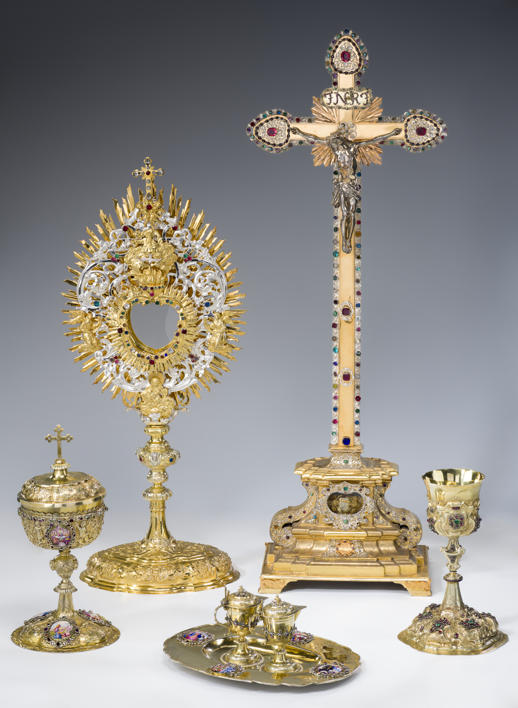 HerunterladenLiturgische Geräte (Ziborium, Strahlenmonstranz, Messkännchengarnitur, Altarkreuz, Messkelch, v.l.n.r.), zw. 1715 und 1739/1740,