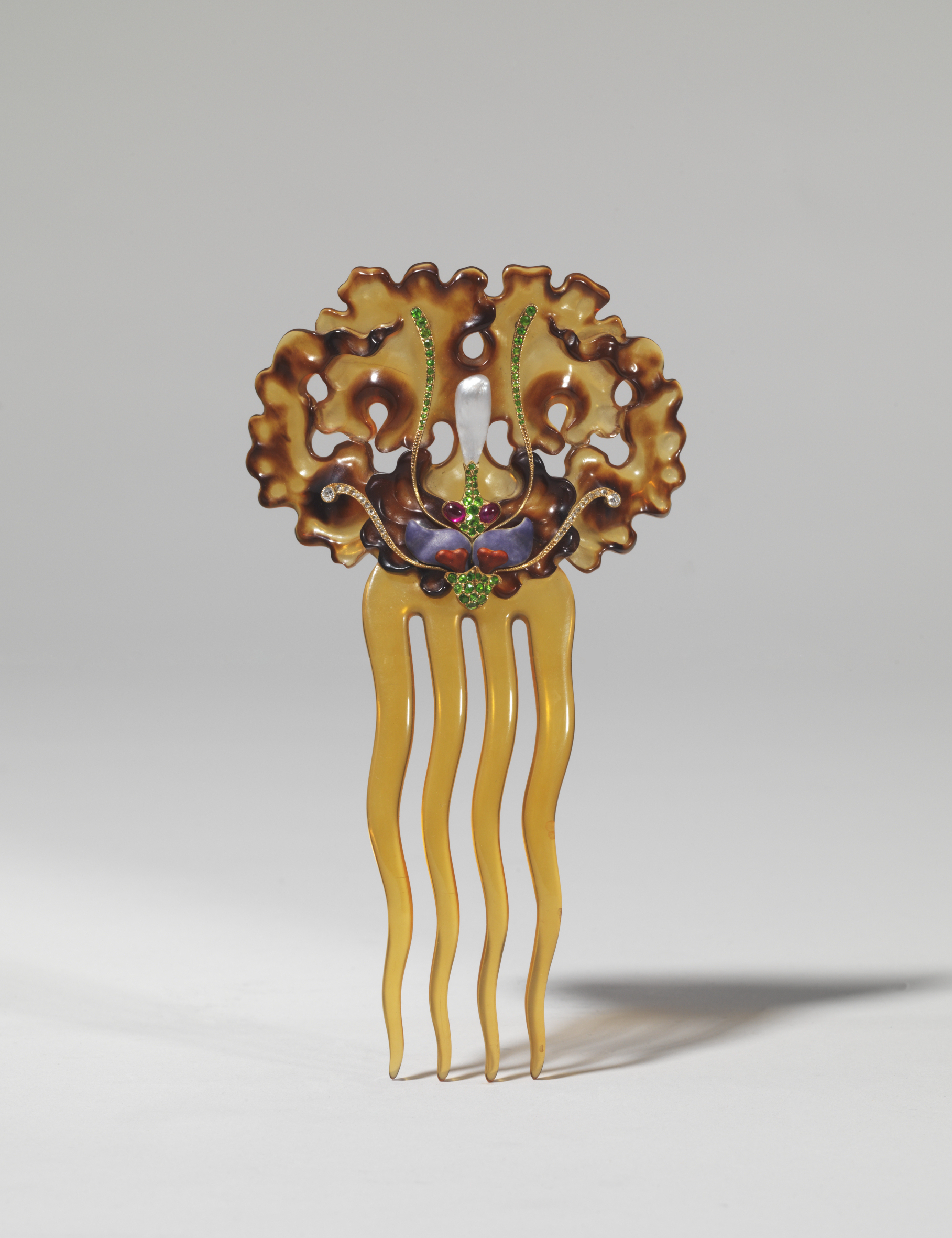 Der Kamm besitzt die Gestalt eines phantastischen Meereswesens. Die wellenförmigen Zinken erinnern an die Tentakel einer Qualle. Die Schmuckplatte besitzt die Form von Meeralgen. Über den Zinken sitzt ein phantasievoll aus Edelsteinen gebildetes Insekt.
