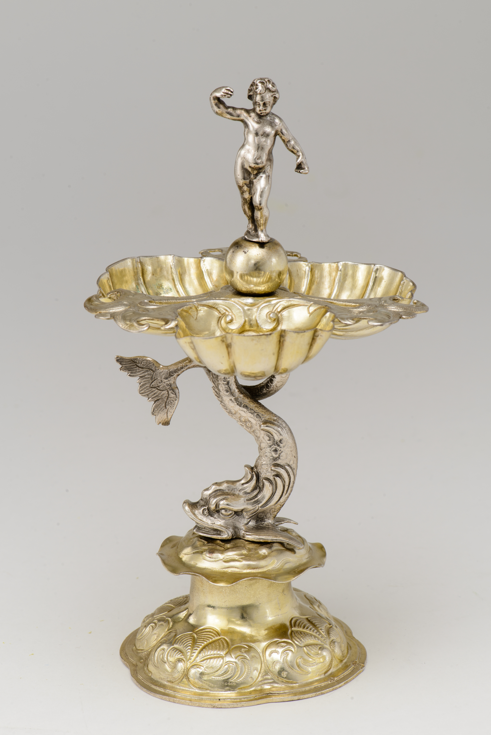 Auf die Herkunft des Minerals aus dem Meer verweisen Muschelwerk und der als Delphin gebildete Schaft der Silberschale. Wie aus den Ozeanen kommt Salz auch aus den Dolomiten, wo sich vor 250 Millionen Jahren ein Meer befand.