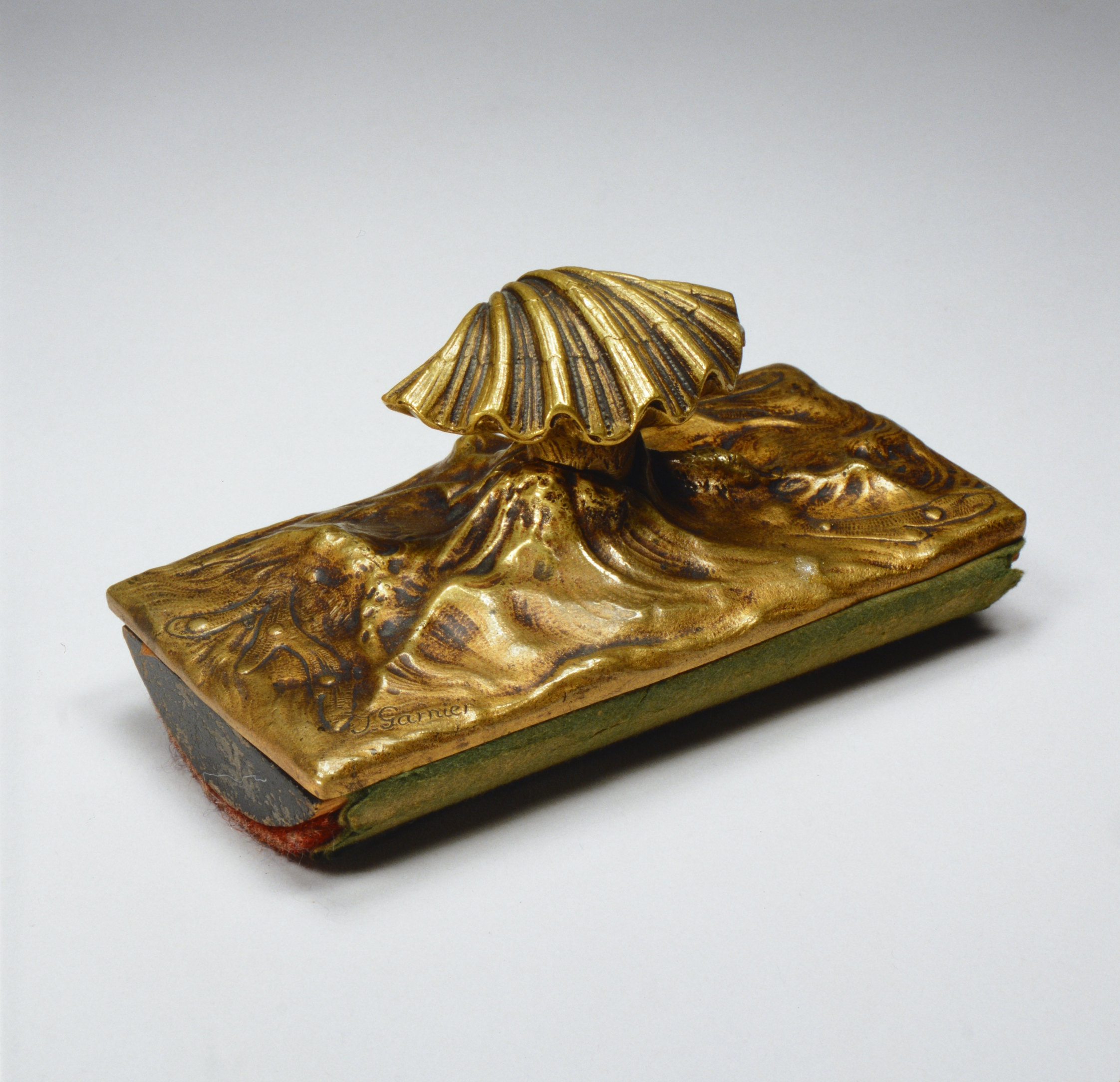 Der Griff des Instruments ist als Schale einer Kammmuschel gebildet. Die Bronzeplatte weckt die Illusion der wogenden Meeresoberfläche, in deren Wellen Seetang treibt. Amüsant bezeugt die plastische Gestaltung eine Vorliebe des Jugendstils für das Motiv bewegten Wassers.