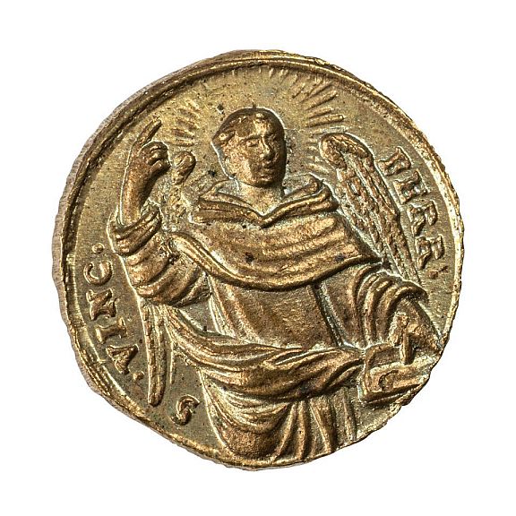 Vorderseite: Aufschrift: "S. CATHA - RINA R. V"; Die Heilige Katharina von Vadstena als Hüftbild, die Hände an die Brust gelegt, den Blick nach links unten auf ein auf einem Tisch liegendes Kruzifix gerichtet; Außen Schrift. Rückseite: Aufschrift: "S - .VINC. - FERR:"; Hüftbild des Heiligen Vinzenz Ferrer mit Flügeln, seine linke Hand zeigt nach oben; Außen Schrift.